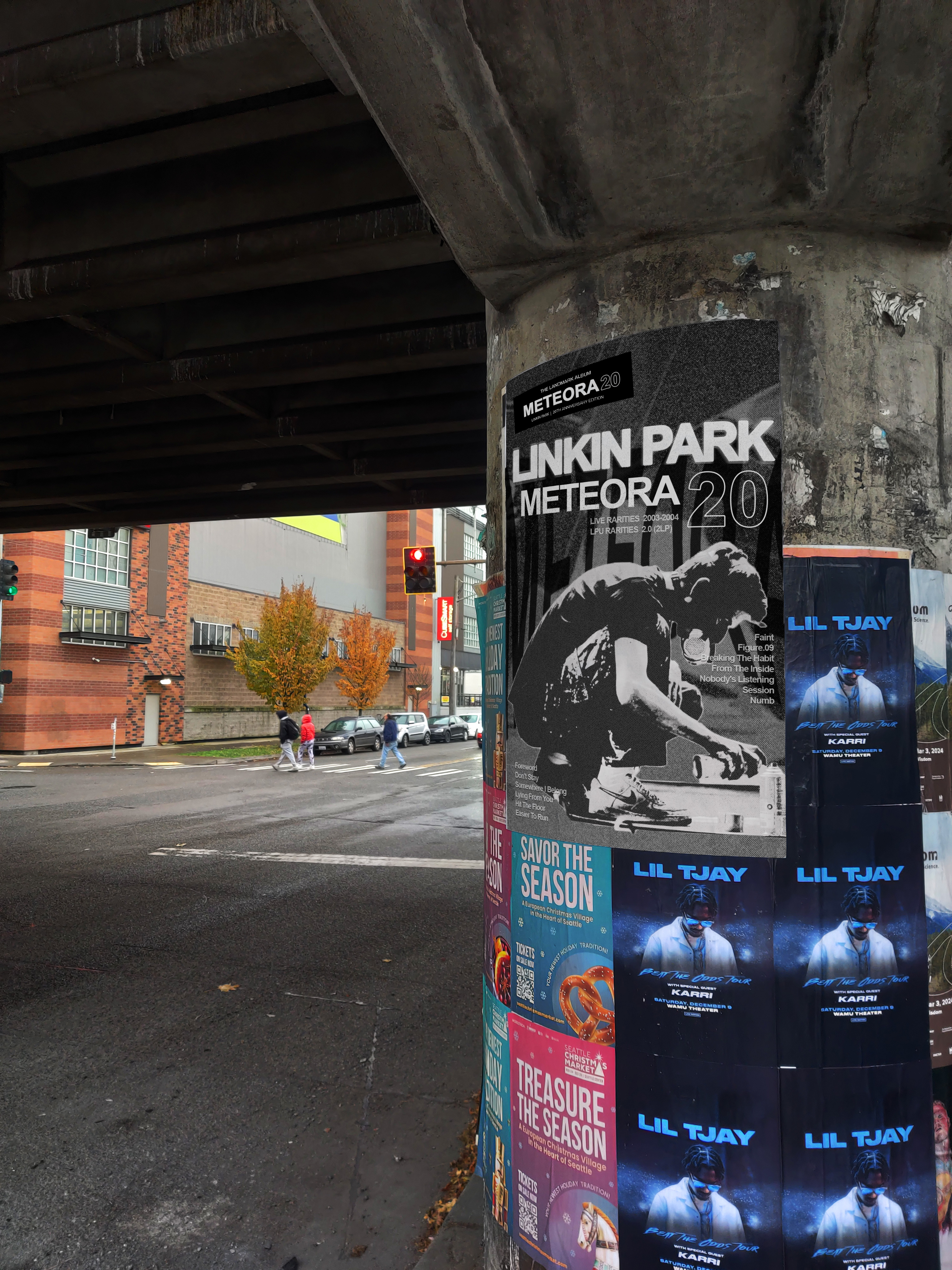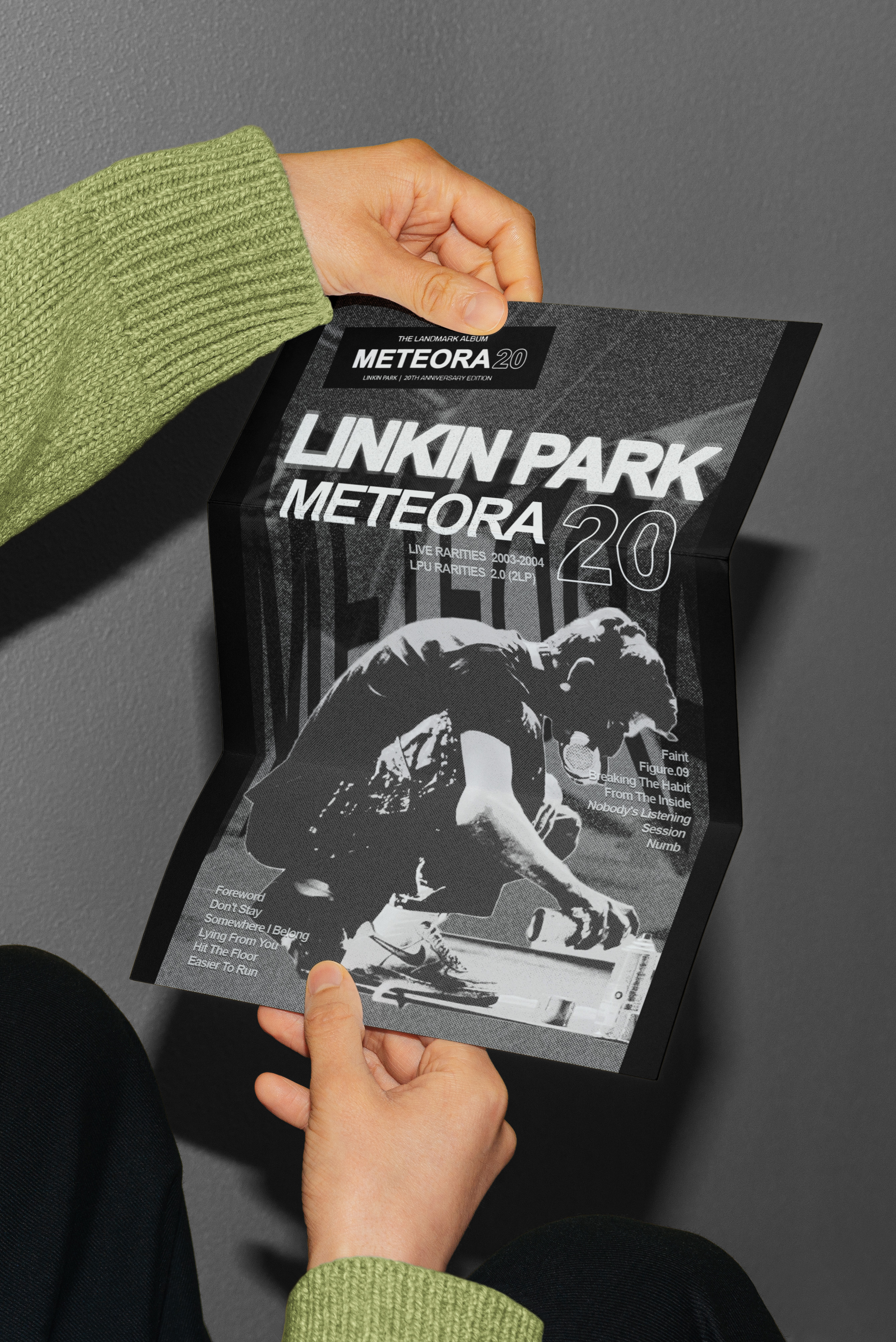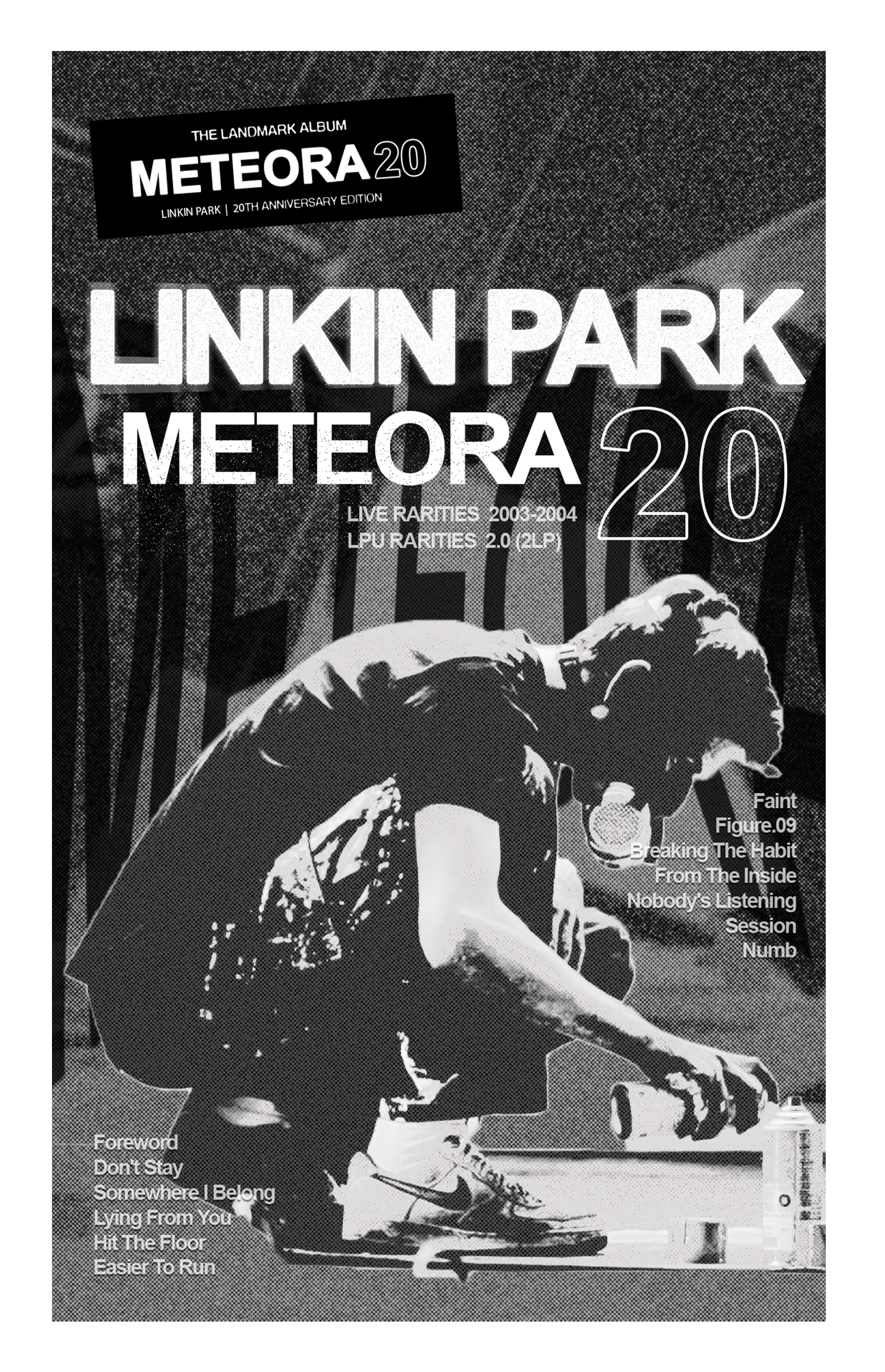 A captivating poster was designed for Linkin Park's Meteora album, capturing the album's intense, raw energy. The design integrates urban street art elements with a grunge aesthetic, reflecting themes of struggle and resilience. Bold typography, distressed textures, and dynamic imagery inspired by the band's iconic style visually echo the emotional depth and power of Meteora, creating a striking tribute for fans and a bold statement piece for any setting.